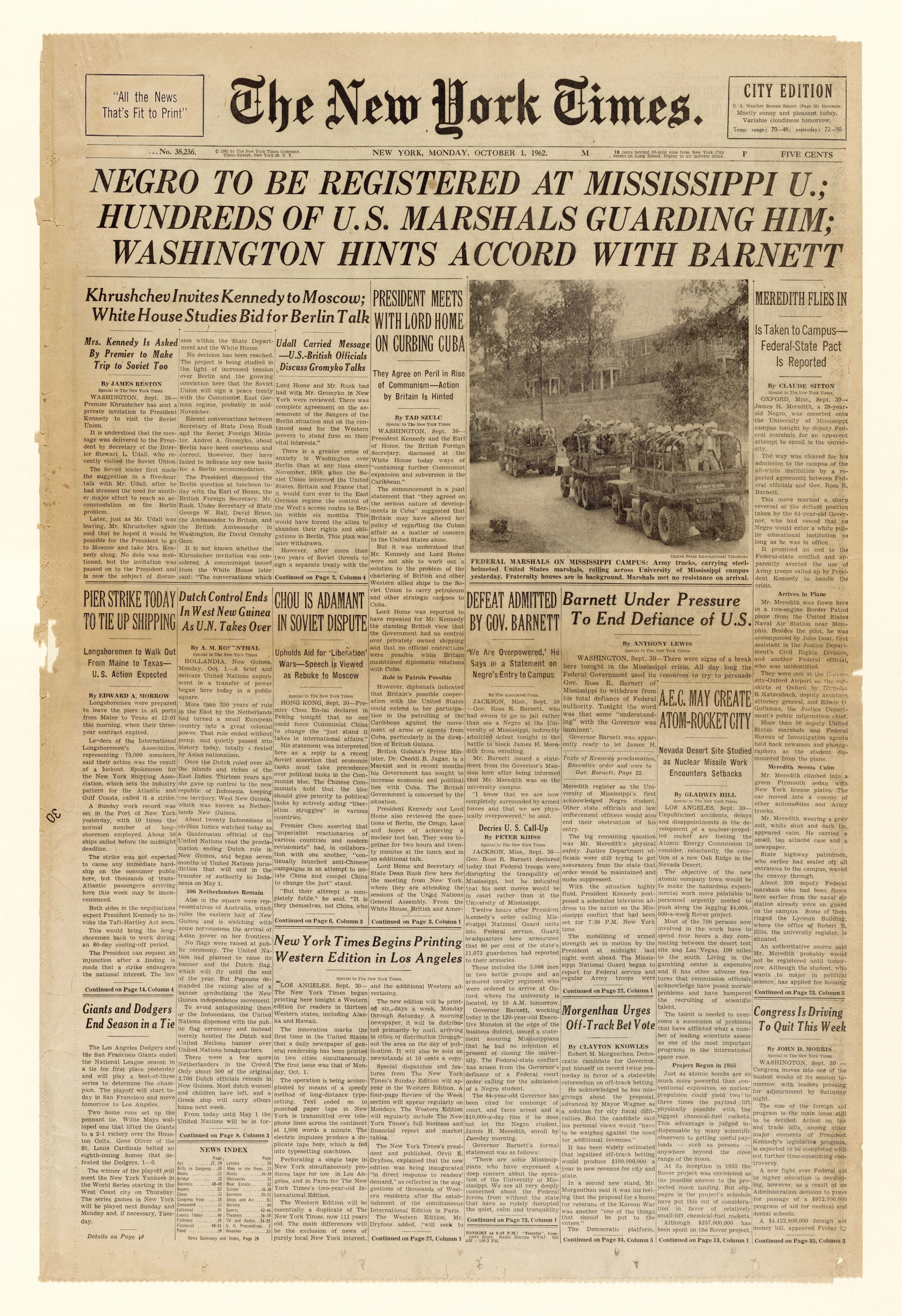 The New York Times was founded 1851, and early on the newspaper focused on providing international news coverage for its readers. Almost a century later, in 1947 the Times became one of the first national news services to establish a Southern bureau. Jonny Popham, that bureau’s first correspondent, wrote reports that showed the moderate voices in the South, but missed stories of racial tension and signs of coming violence. But in 1958, Georgia-born reporter Claude Sitton replaced Popham and began to break stories that showed the full nature of the civil rights movement. Soon after, the Times opened other Southern bureaus. Despite being sued by Montgomery, Ala. Police Commissioner L.B. Sullivan for libel — and having to cease reporting in Alabama until the Supreme Court ruled in favor of the newspaper — the Times was a leader in covering civil rights events. The New York Times continues to be an internationally recognized paper.