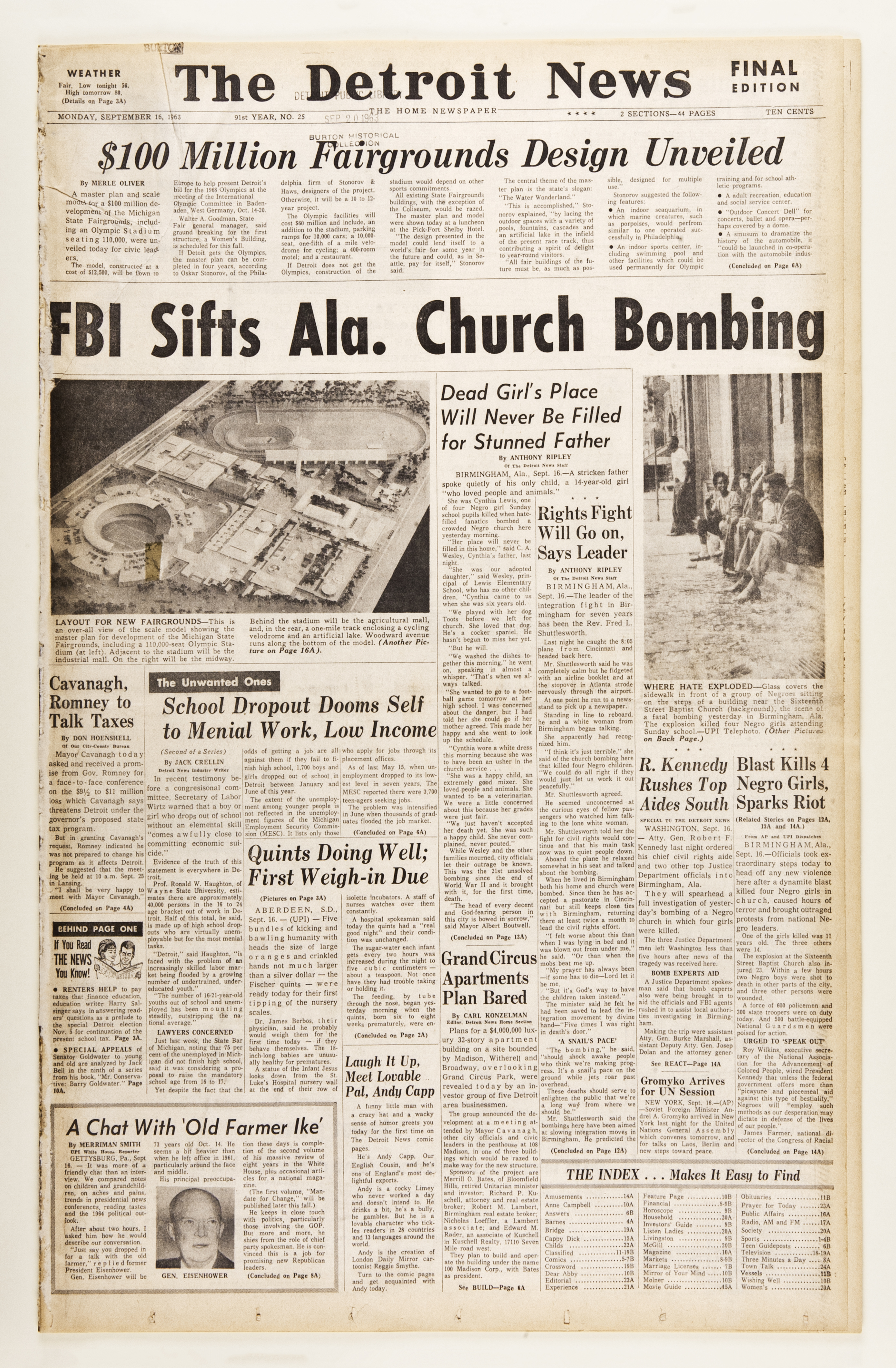 The Indianapolis Star was founded at the turn of the 20th century with the declaration that it would be “an independent paper for the people — a newspaper, not an organ” (that is, a tool for politicians to spread their messages). The morning daily directly competed with The Indianapolis News, and after 1948, developed a larger circulation among white readers. (The black community tended to support The World, The Ledger, The Freeman and The Recorder.) Eugene C. Pulliam, a Republican, bought the Star in the 1940s, as he expanded his media empire. Editorials tended to follow Pulliam’s views. However, the Star featured op-eds that opposed the newspapers’ views and were prefaced by a quote from Voltaire: “I disagree with what you say, but I will defend to the death your right to say it.