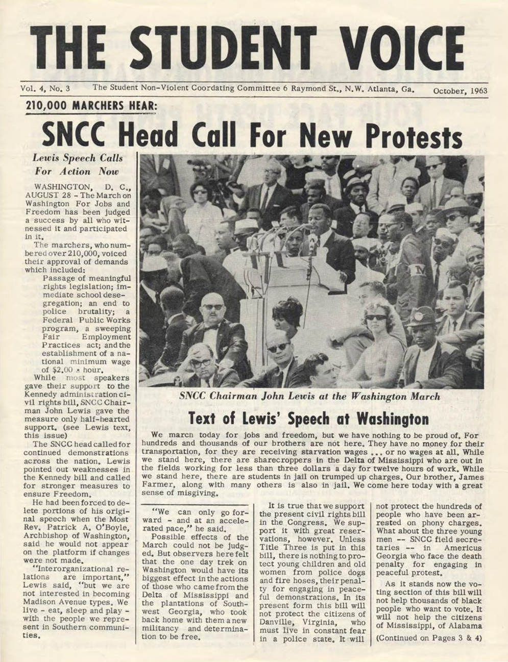 The Atlanta-based Student Nonviolent Coordinating Committee (SNCC) founded The Student Voice in June 1960. SNCC started a newspaper to improve communications and publicize their members’ work; to provide accurate coverage of the civil rights movement and to “present to northern supporters news which the press was not covering.” Later goals included communicating with potential donors and selling SNCC materials such as records and posters. SNCC distributed its paper across the country, particularly at college campuses. The paper changed its name in June 1965 to The Voice; its final issue was on Dec. 20, 1965.